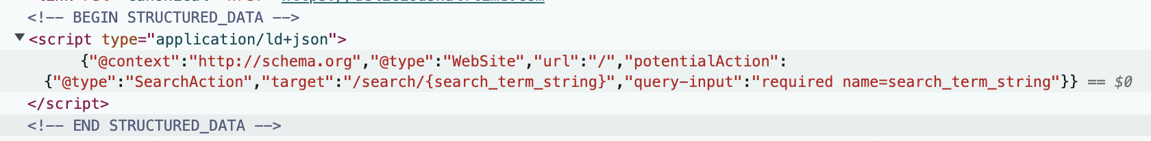 <script type="application/ld+json"> {"@context":"http://schema.org","@type":"WebSite","url":"/","potentialAction":{"@type":"SearchAction","target":"/search/{search_term_string}","query":"required name=search_term_string"}}</script>