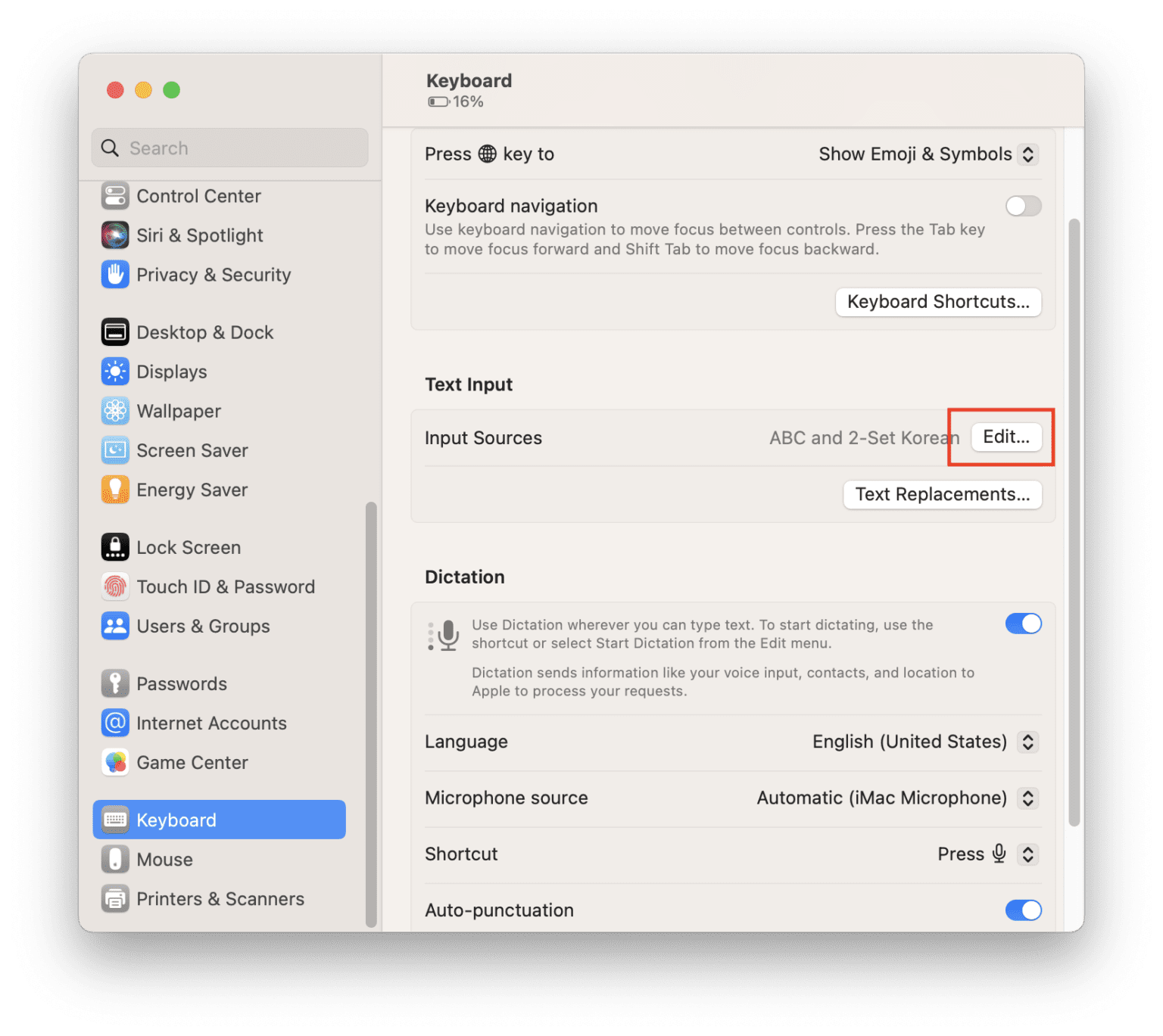 System Setting -> Keyboard -> Text Input / Input Sources -> Edit