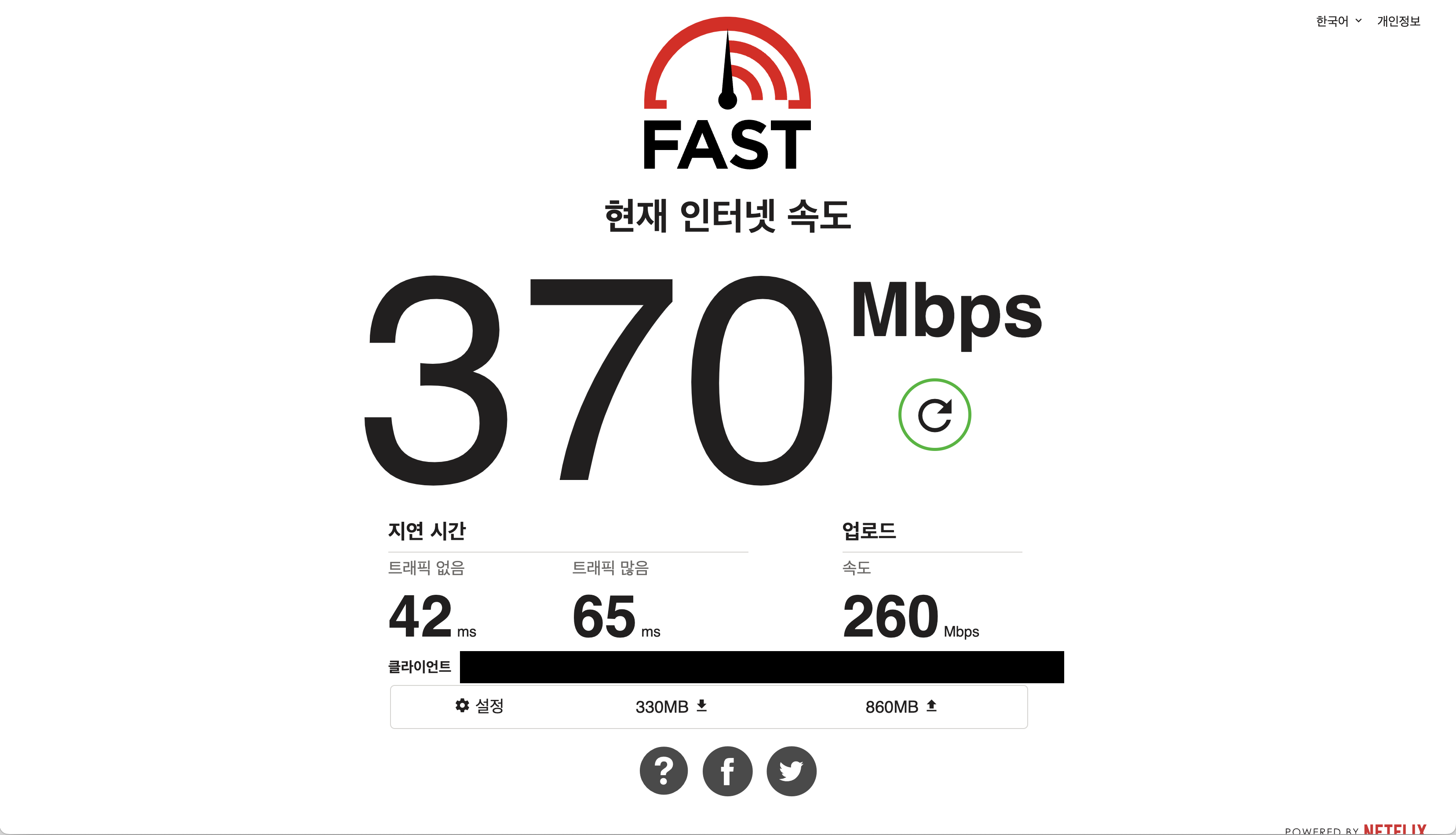 속도 측정은 https://fast.com/ 에서 진행했습니다. 제가 애용하는 곳이고, 외우기도 쉽고, UI도 간소합니다.