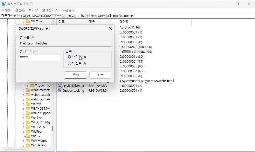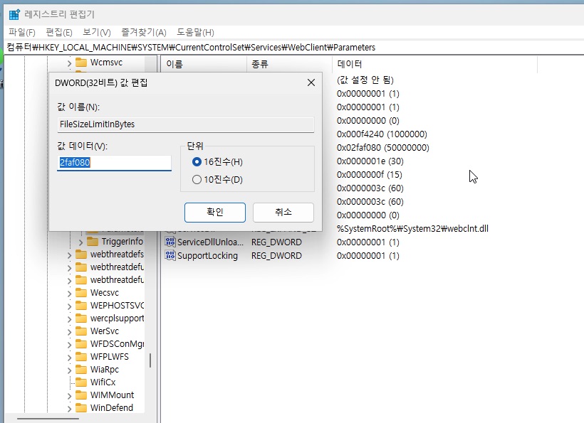 위치는 HKEY_LOCAL_MACHINE\SYSTEM\CurrentControlSet\Services\WebClient\Parameters 에 있습니다.