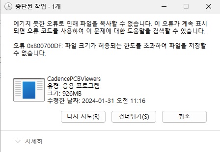해당하는 오류는 네트웍 드라이브에서 사이즈가 큰 파일을 다운로드(복사)하려고 할 때 발생 할 수 있습니다.