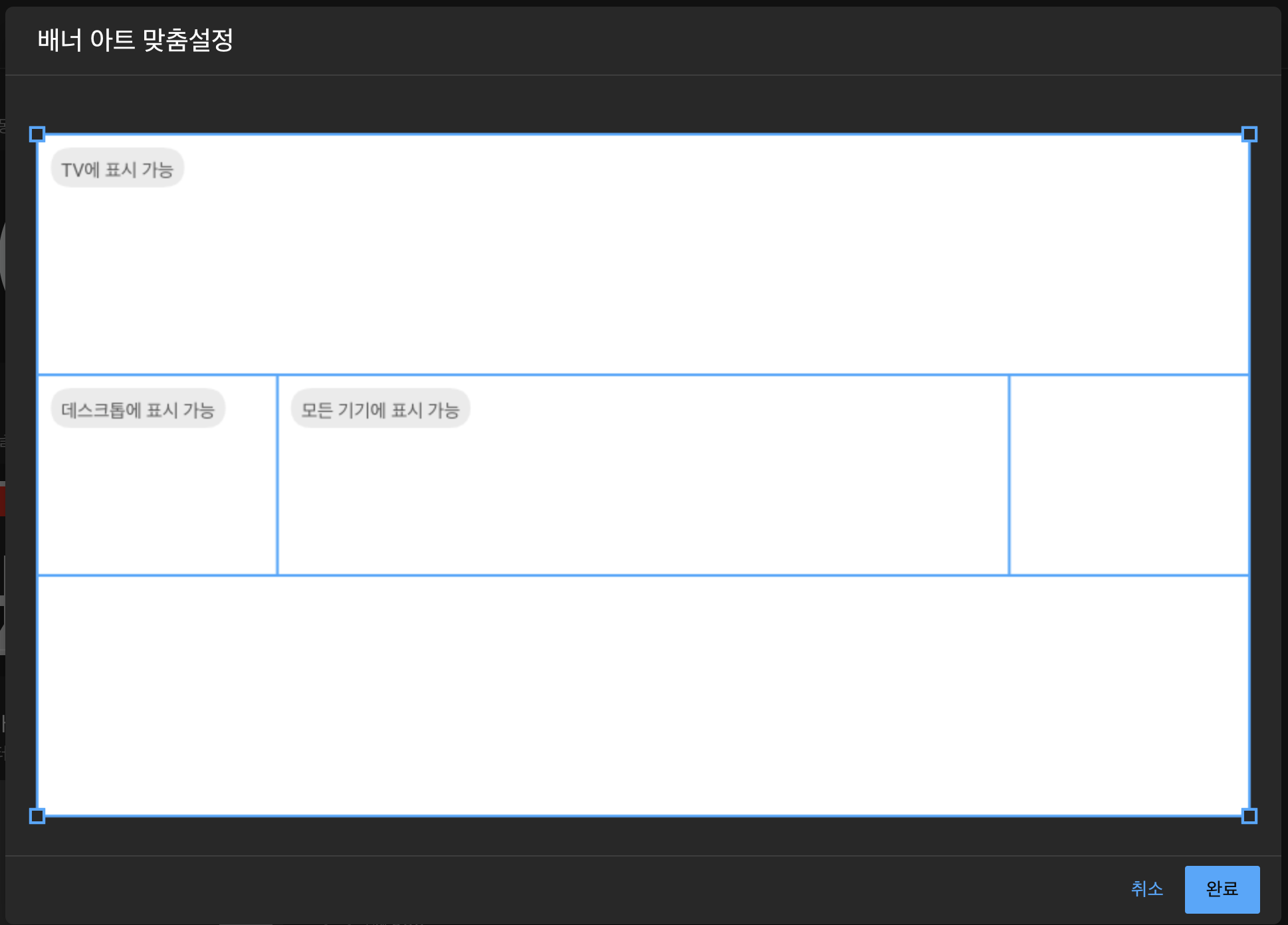 16:9 사이즈의 이미지를 업로드 하면, 유튜브는 각 디바이스에 맞게 이미지를 크롭핑 해서 사용합니다.