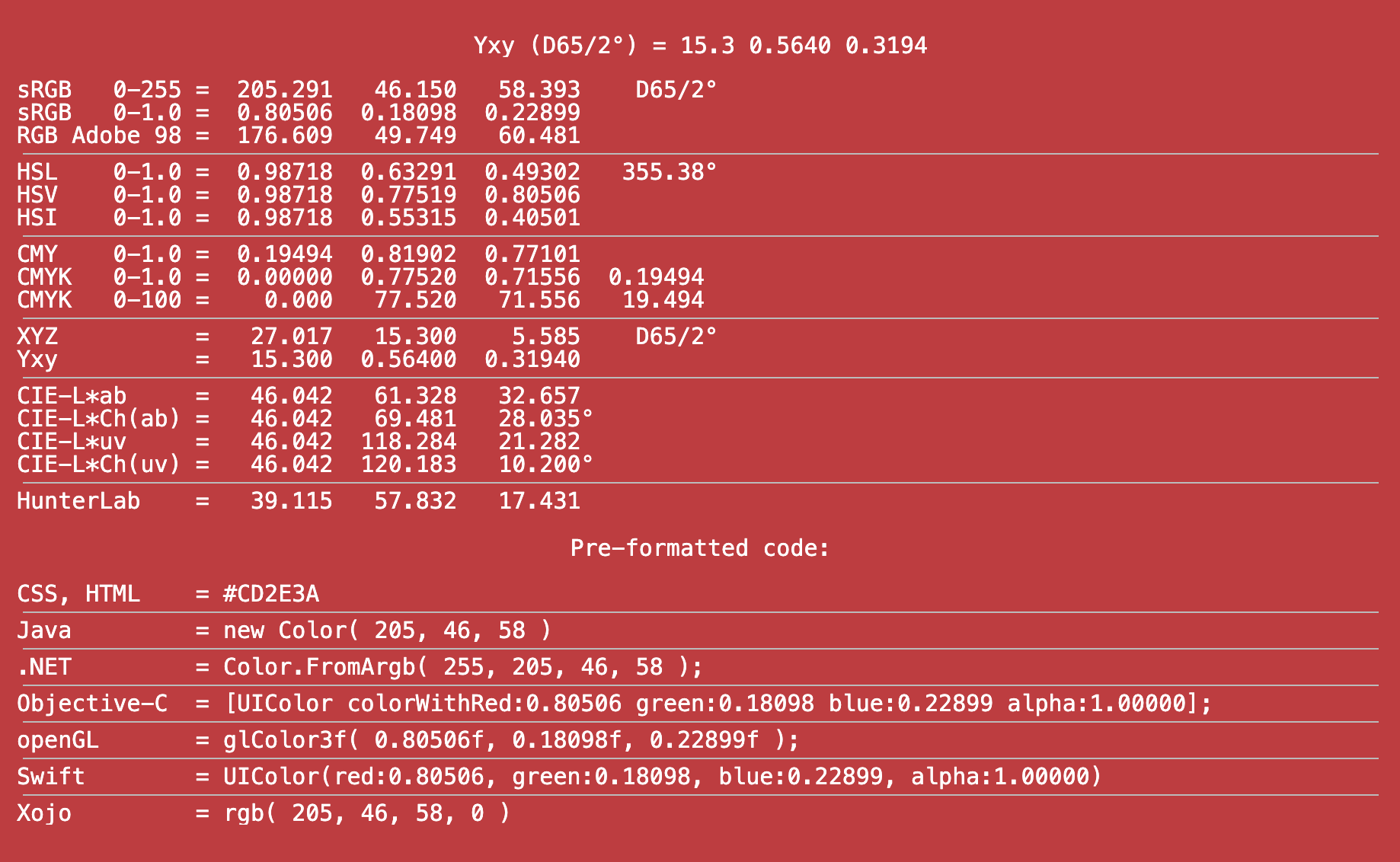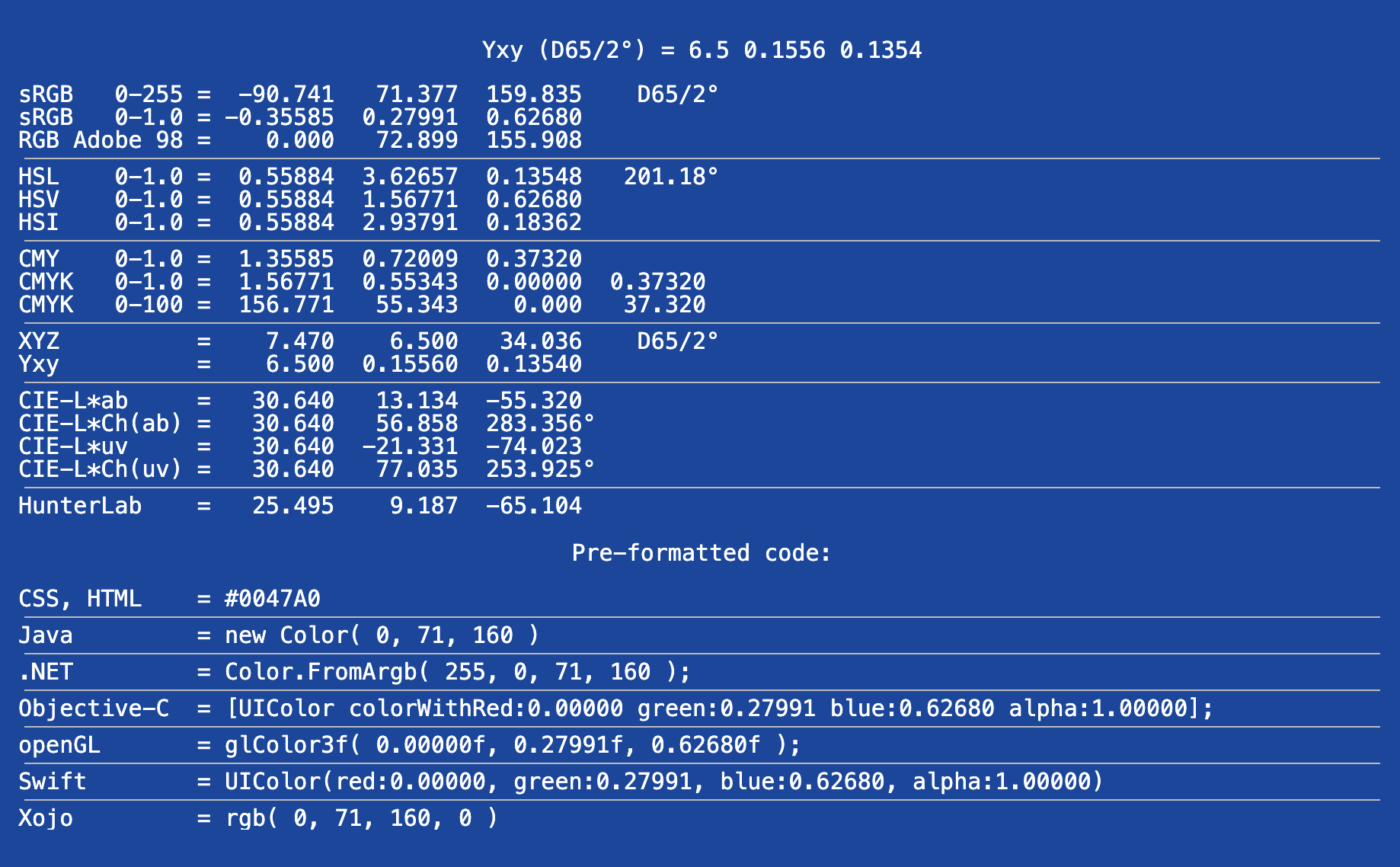 Select data type ... sRGB 0-255sRGB 0-1.0AdobeRGB 0-255HTML 0-FFFFFFCMY 0-1.0CMY 0-100CMYK 0-1.0CMYK 0-100XYZYxyCIE-L*abCIE-L*Ch°(ab)CIE-L*uvCIE-L*Ch°(uv)Hunter-Lab A (incandescent)BCD50D55D65 (daylight)D75EF1F2 (fluorescent)F3F4F5F6F7F8F9F10F11F12 2° (